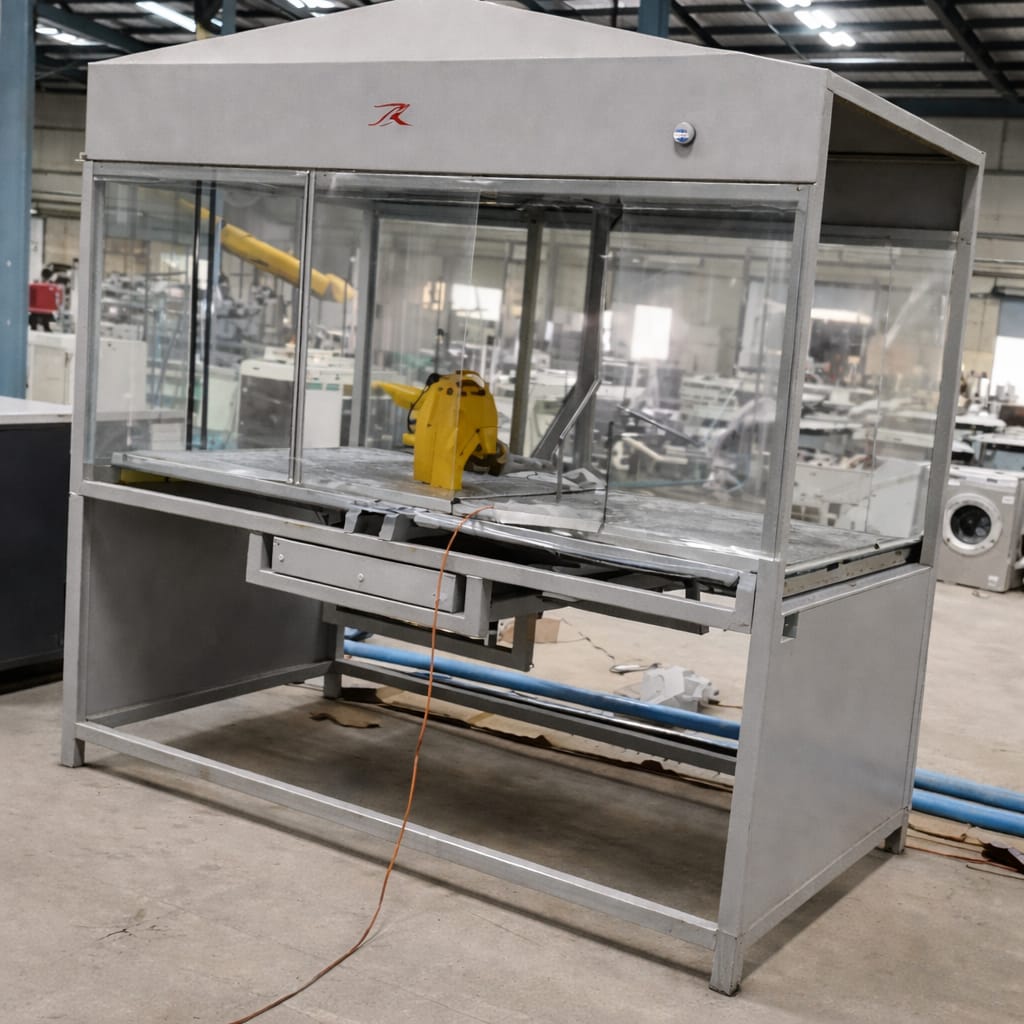 Purpose: Cuts large LCD glass sheets into small panels for phones, TVs without cracks. Glass Table: Vacuum holds thin glass (0.3-1mm) flat and steady. Diamond Wheel: Rolls to score (scratch) exact cut lines on top side. Computer Control: X-Y arms move cutter for straight/curved/grid patterns. Flip & Score: Turn glass, score bottom side matching top. Breaker Roller: Bends glass to snap cleanly along scores. Speed: Hundreds of panels per minute, auto depth check. Coolant: Spray keeps glass cool, no dust. Result: Smooth edges, 99% perfect panels for assembly. Use for :- Separate the frame and LCD screen and more Type :- LCD Panel / TV Handling Capacity Separation :- CRT into funnel & panel LCD size:- 14~33 inch Operations :- Low power consumption Table size :- 4(L) x 6(B) ft.